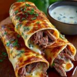 Experience French Dip bliss in a new way! Tender roast beef and provolone, rolled in soft tortillas, served with warm, savory au jus for dipping.